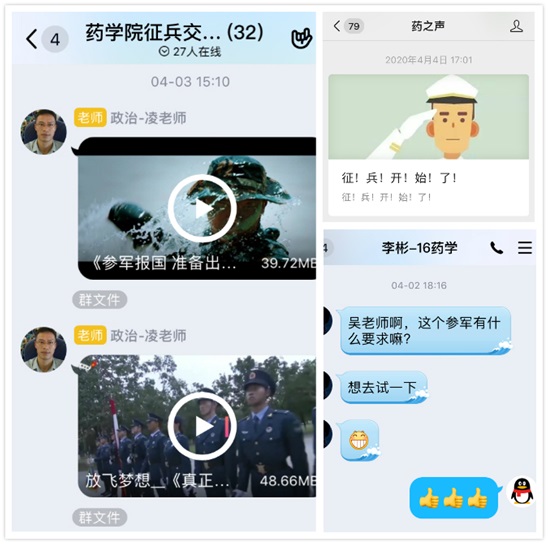 在征兵宣传动员中,同学们积极向年级辅导员了解征兵时间、基本条件、报名基本程序、优待政策、体检标准、入伍后发展等方面最新政策。2016级药学专业李彬同学表示:“我在收到征兵通知后第一时间与辅导员取得联系,表达自己参军入伍的想法,但是又担心视力不佳而导致体检不通过。经过辅导员对征兵政策的耐心解读,我决定坚定参军信念。党和国家号召我们青年大学生参军入伍,这是历史赋予我们的重任,也是每一位中国公民应尽的光荣义务。”