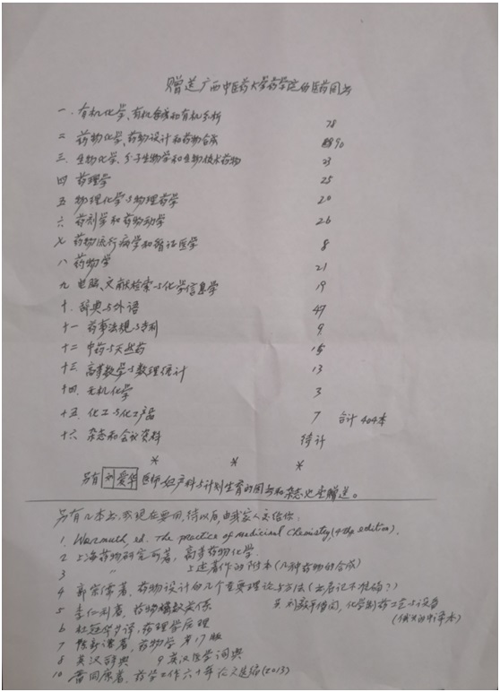 雷同康教授为药学院的发展做出了巨大贡献:明秀校区药学楼就是在雷教授及其他药学界人士的帮助下筹集资金组建完成的;同时,他也在广西中医学院(Beat365中国唯一官方网站前身)药学系担任药物化学教学5年。35年前,雷同康教授用他的所学所能助力药学院的成长;35年后的今天,他继续将他生平积累的所有书籍无私捐赠给药学院。