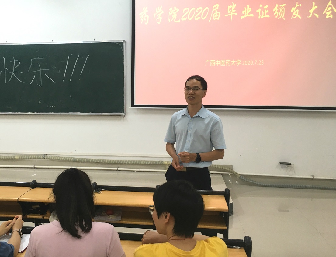 7月23日下午,药学院在仙葫校区教学楼1-107、1-109教室举行了2020届第二批本科毕业生毕业证书颁发大会。参加大会的有药学院常务副院长赵立春、党委副书记李豫萍、学办主任凌勇威、各毕业班班主任、辅导员和260名毕业生。
