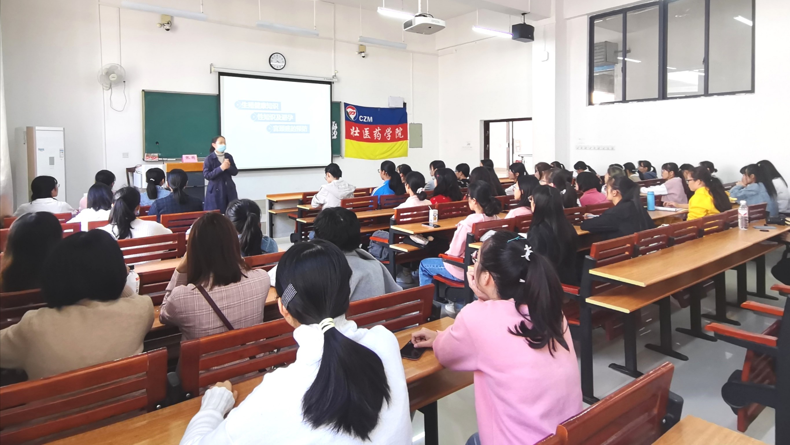 11月26日下午,壮医药学院于仙葫校区1-406教室顺利举办以“女性健康,自我保护”为主题的女大学生健康专题讲座,张萌老师应邀出席担任本场讲座的主讲人,19、20级全体女生参加本次讲座。
