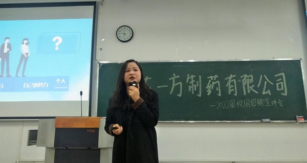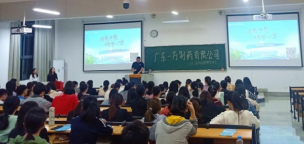 参加本场宣讲会的有广东一方制药有限公司总部人力资源中心副总监张苏苏、主管刘晓仪、专员卢玟蒽,广东一方制药(广西)有限公司人力资源部经理陈琳、主管阳宇婷,宣讲会由药学院毕业班辅导员刘航主持。