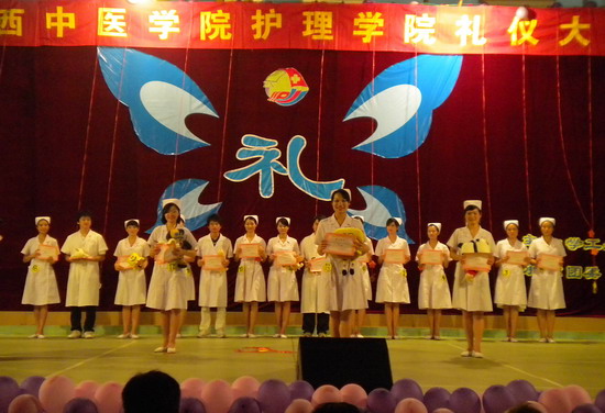 2010年6月8日19:30,广西中医学院护理学院“星光闪耀,护‘礼’情缘”礼仪大赛在东葛校区隆重举行。到场嘉宾有第一临床医学院教学办、学工办主任林强,广西中医学院护理学院党委书记岑家铭、党委副书记罗艺徽以及各二级学院学生代表。
