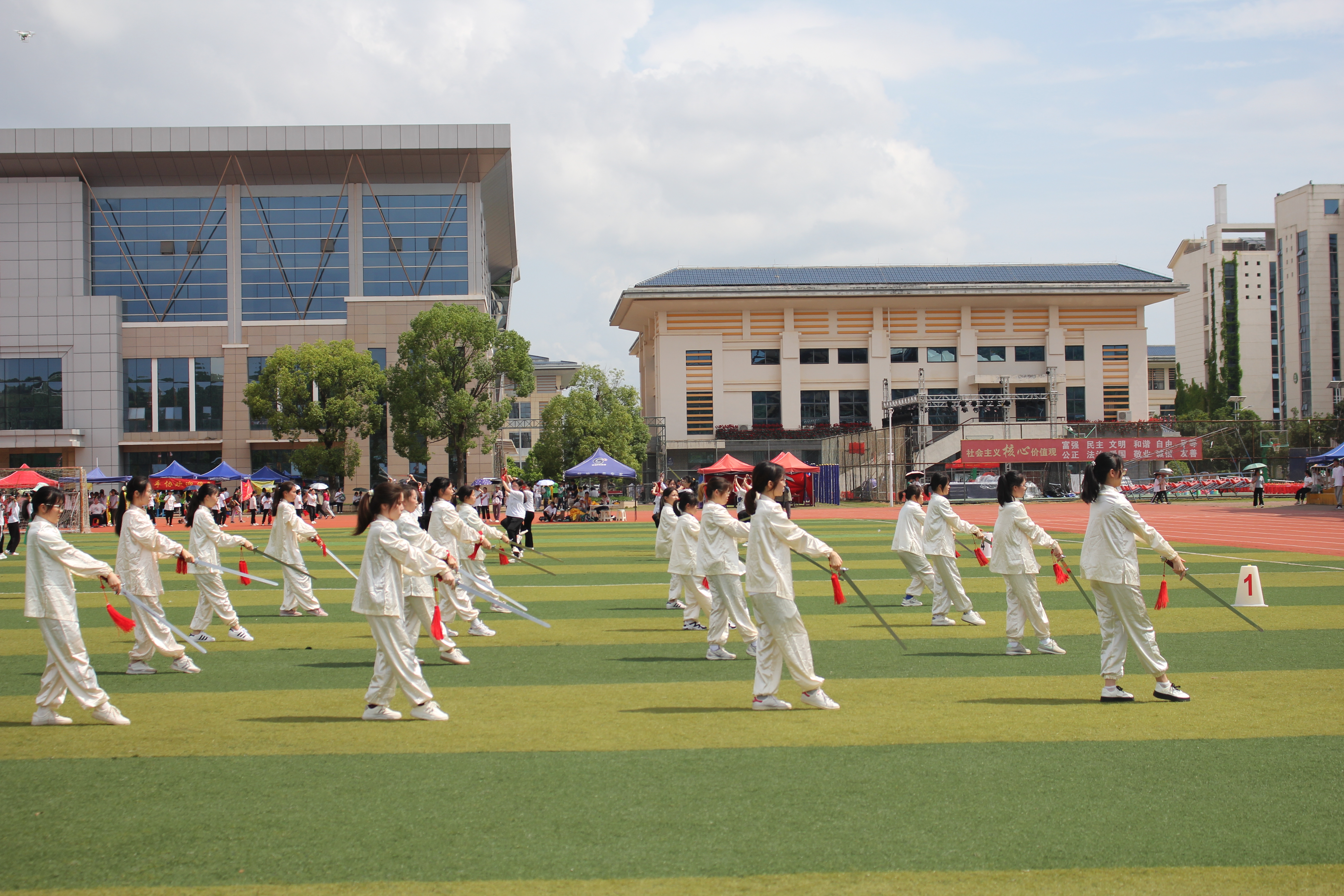 在太极拳比赛中,壮医药学院各班参赛健儿精神抖擞,一举一动尽显文武之道,展现了太极拳含蓄内敛、连绵不断、以柔克刚、急缓相间的特点。在三路长拳比赛中,我院健将动作干净利落,尽显三路长拳“形合力顺,动迅静定”的特点。在太极剑比赛中,我院学子在烈日下挥舞长剑,一开一合间体现了太极剑“轻灵柔和,绵绵不断,重意不重力,同时又优美潇洒,剑法清楚,形神兼备”的特点。