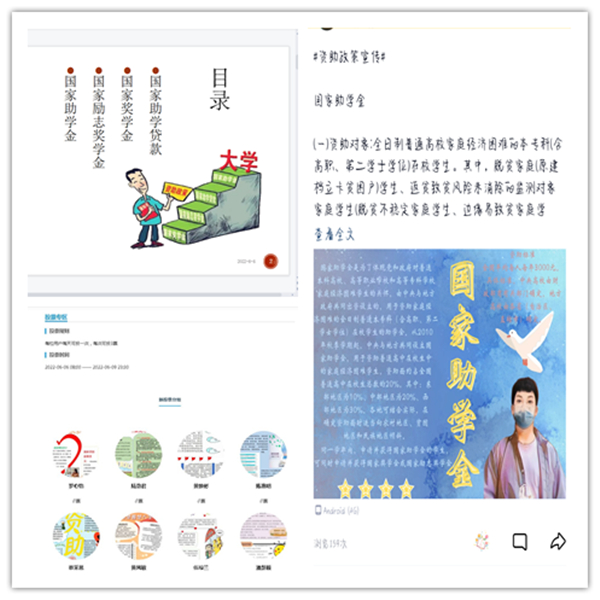 电子手抄报比赛的评比采用QQ空间+易班投票的形式进行,参赛选手制作好手抄报以后,将手抄报发布在QQ空间收集同学们的点赞,在活动过程中,起到了广泛的国家资助政策的宣传作用。PPT课件制作比赛中,采用了学院老师评比的方式进行,参赛选手选取资助政策的内容进行了详细的说明,他们的课件制作非常详尽,对国家资助政策都进行了细致的说明。