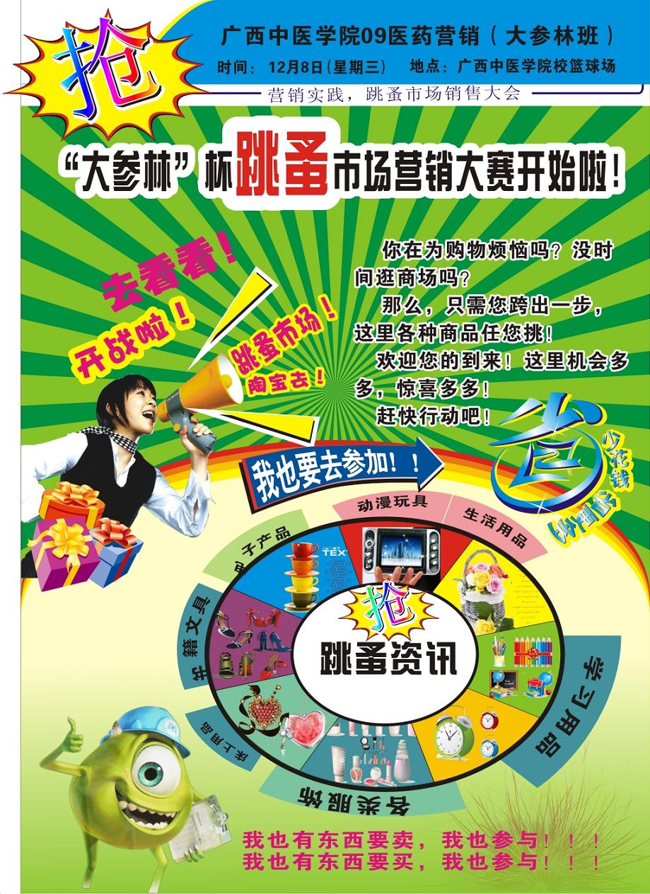 为了让同学们更好地把理论与实践相结合,深入了解、分析市场营销的理念、方式与策略,在实践中提高学生的合作、创新与营销能力,高等职业技术学院2009级“大参林订单班”全体学生在药学院专业老师的指导和Beat365合作办学企业广东大参林连锁药店有限公司的鼎力支持下,于12月8日在学校体育场成功举办了“大参林杯跳蚤市场营销大赛”活动。