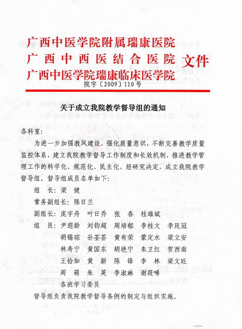 建立科学、完善和有效的教学质量监控体系是实现教学工作有序运转、教学管理严格规范、教学质量稳步提高的重要保障。瑞康临床医学院本着“以督促管,以督促教,以导促建;以导促学,管教建学结合,重在指导”的原则,结合该院实际,组建由医院院长为教学质量第一责任人,由教务学生科牵头、医务科及临床科室协调配合,教学指导委员会、教学督导委员会专家参与的后期教学管理和质量保证的组织系统,不断建立健全教学质量监控体系,按照整体性、可行性、发展性原则建立并完善各层面、各主要教学环节的后期教学质量标准,作为衡量后期教学质量、约束后期教学过程、改善后期教学管理的准绳,加强对教学工作各环节的管理与监控,其中成立了教学质量控制办公室负责日常事务,成立由教师、医师组成的教学督导小组,成立由学生组成的教学督导小组,聘任临床医技科室教学秘书,并通过开展临床见习带教教研室交叉督导,督导专家评议反馈,教学质量监控总结汇报会,教学质量监控简报等形式使各项教学活动有法可依、有章可循,保证了教学工作的顺利开展和有序运行。