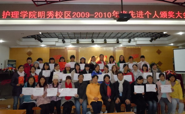 为了进一步加强学院学风建设,使同学们勇于比、学、赶、超,求真创新,勤奋思考,努力学习,不断提高自身综合素质,成为德才兼备、全面发展的大学生。护理学院于2011年1月11日下午6点在广西中医学院大学生俱乐部三楼隆重举行了2009—2010学年度我院(明秀校区)学生获学校奖学金和先进个人的颁奖仪式。参加此次颁奖仪式的领导老师有:护理学院党委副书记罗艺徽老师、学工办许凤琼主任、以及学工办林峰、黄燕良老师。