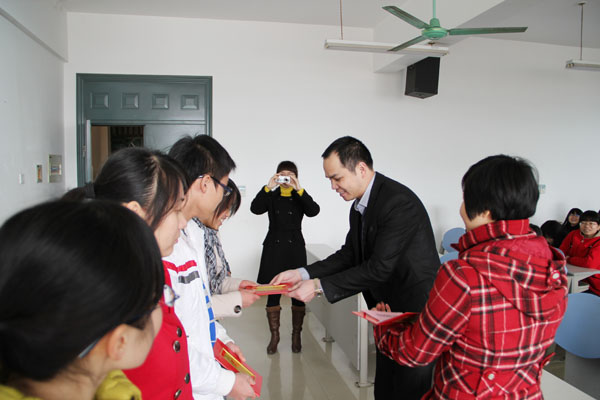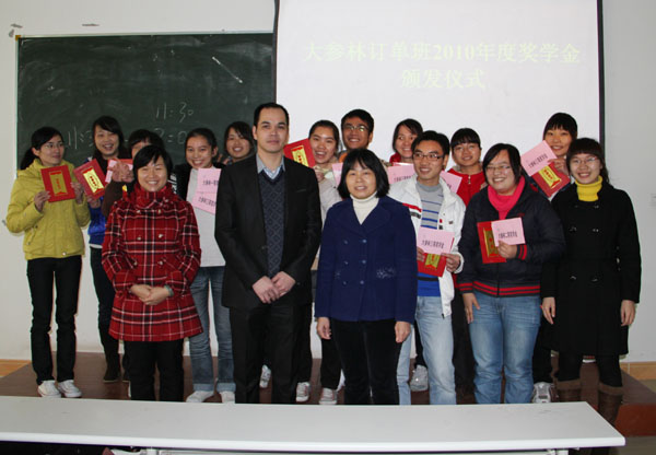 为了鼓励“大参林“订单班学生努力学习,“大参林”特别设立了“大参林”奖学金,专门奖励品学兼优的学生。奖学金分为三个等级:一等奖2名,500/.年;二等奖4名,300/.年;三等奖6名,200/.年。通过“大参林”公平、公正地评选,2009级医药营销(大参林订单班)凌自聪等12位同学分别获得了20092010学年度一、二、三等奖学金,奖金共计3400元。陈洪总经理在仪式上亲自为获奖学生颁发了奖学金和荣誉证书。最后,高职院邓远美院长作了动员讲话,鼓励同学们以获奖的同学为榜样,好好学习,天天向上,早日成为“大参林”合格人才。