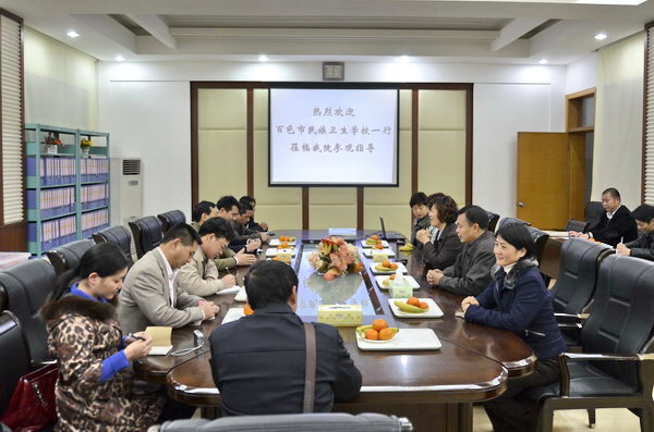 3月9日下午,百色市民族卫生学校岑怀芳校长一行8人来访护理学院,考察护理实训中心并进行交流座谈。护理学院院长吴彬,党委书记岑家铭等领导参加了交流座谈会。