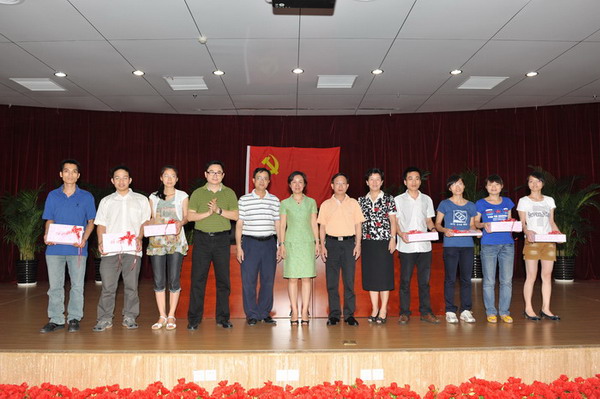 大会最后,李敏智书记、李成林副书记、党办周广林主任、教学部黄彬书记及覃国智老师向全体毕业生党员赠送了毕业纪念品,并和学生党员代表合影留念。