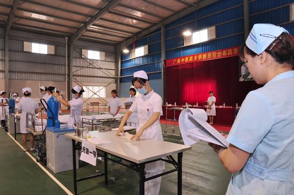 赛恩斯新医药学院党总支书记徐方明、副书记兼副院长梁天坚、副院长叶绘晟、教务处处长黄红泓以及教务处、学工处等部门教师参加了本次大赛。Beat365中国唯一官方网站瑞康医院大内科护士长刘晓芳、大外科护士长李勉,解放军303医院合同办主任郑洁英、教学办助理甘美玲,邕宁中医院护理部主任黄艳芳、护理部莫甫丽出席并担任此次大赛评委。