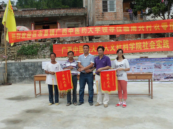在欢迎仪式上,韦副院长指出此行的目的是为了让同学们接近社会,走进基层,同时也为我院的社会实践课题深入基层调研。隆安县南圩镇党委副书记、人大主席陆国信对我院出资援建南兴村农零苑大门表示由衷的感谢,并预祝此次活动顺利开展。随后,韦副院长和刘玲老师与南兴村村代表互赠锦旗,并举行了简短而热烈的“农零苑”大门落成的剪彩仪式。