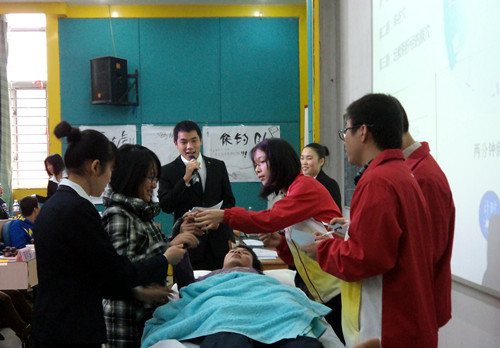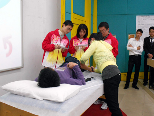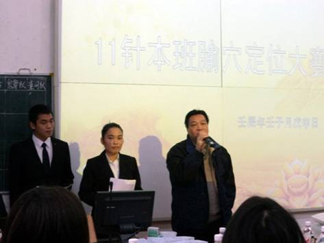传承发扬中医特色文化,更好地调动同学们学习热情,20121213日,11级针本班在西梯一教室举办了第一届经络腧穴定位大赛。针灸推拿学院院长范郁山教授、针灸推拿学院办公室主任赵彩娇教授、周纯芳老师、童伯瑛老师、芮靖琳老师以及参加全国针推技能大赛选手、针推学院各班级代表和班级志愿者出席了大赛。