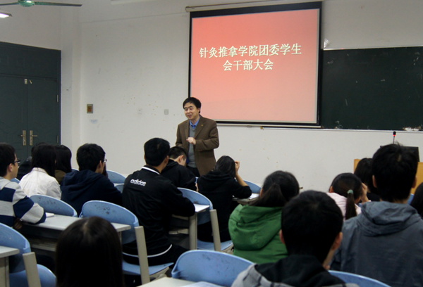 3月6日晚,针推学院党政领导又组织召开了分团委学生会干部大会。会上针推学院团委、学生会负责人总结了2012年的工作,布置了2013年工作。蒋书记在会上以互动的方式与学生进行了交流,了解学生在寒假的生活和学习状况。他鼓励同学们要始终保持充沛的活力,自强不息。要注重理论与实践的结合,增强实践动手能力。在工作上要总结去年开展活动的做法和经验,提炼干部的作用和校园文化的特色,多出成果。对2013年针推学院的学生工作提出了指导性意见。