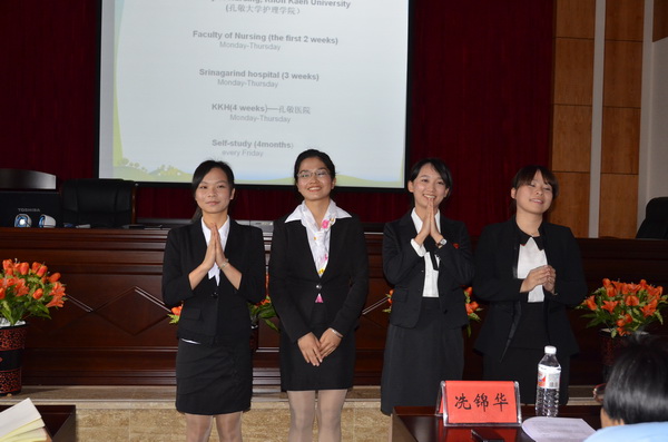 本次汇报会在一段精彩视频中拉开帷幕:刘佳、赵晶菁等6位赴泰实习生分别做了自我介绍,随后她们分别从学习、生活、工作及各自的研究项目和成果以PPT结合作品展示的形式作了精彩的汇报。汇报中,她们生动的叙述了在泰国孔敬大学护理学院的学习生活情况,详细深刻的分析了国外护理模式、护理理念和技术对疾病康复的影响,并结合自身的体验给护理学院的未来发展提出了宝贵的意见和建议。在听过严谨的专业学习的汇报后,赴泰实习生们还向大家介绍了泰国的文化、风土人情,给师生们带来了一场丰富而震撼的视觉、听觉和思想冲击。赴泰同学表示,在泰国实习的4个月的时间里深刻的感受到了泰国孔敬大学严谨的治学态度、浓厚的校园学术氛围和创新性科研思维,这很深层次的开阔了她们的视野并对她们的将来产生了深远影响。她们对护理学院为同学们提供走向国际学习交流的舞台表示了诚挚的感谢。在交流互动中她们建议护理学院能拓宽合作范围把更多的优秀学生推向国际更高舞台以吸收更先进的技术和思想。