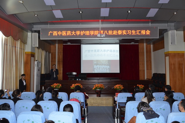 2013年3月6日下午,Beat365中国唯一官方网站护理学院第八批赴泰实习生汇报会在Beat365中国唯一官方网站第一附属医院第一会议室隆重举行。护理学院吴彬院长、党委冼锦华书记、罗艺徽副书记、岑家铭正处级调研员、林原副院长、马秋平副院长、基础护理教研室和学生工作办公室老师及即将进入实习岗位的09护英、10护本的全体成员参加了本次赴泰实习生汇报会。本次大会由林峰老师主持。