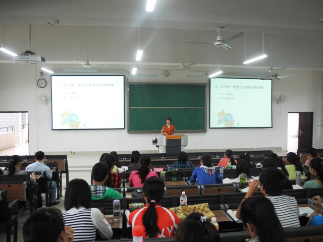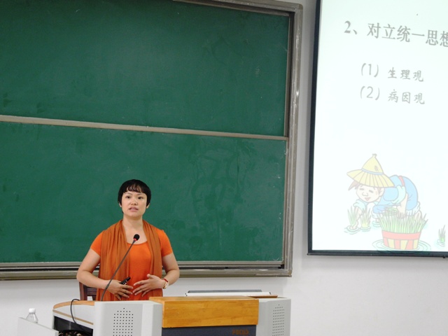 本次示范课授课内容为《马克思主义基本原理》课程,第一章、第二节“对立统一规律是事物发展的根本规律”,要点内容为:马克思主义对立统一规律与中国传统阴阳观。上课过程中,周霞老师语言流畅、教态优雅、充分利用多媒体课件教学,图、文、声并茂,授课技巧巧妙,将哲学原理与实践实例相结合,在授课过程中进行教学互动。尤其是把对立统一的哲原理与传统中医“阴阳观”相结合,辅以深入浅出且精准的阐述,在课堂上同学们掌声阵阵。