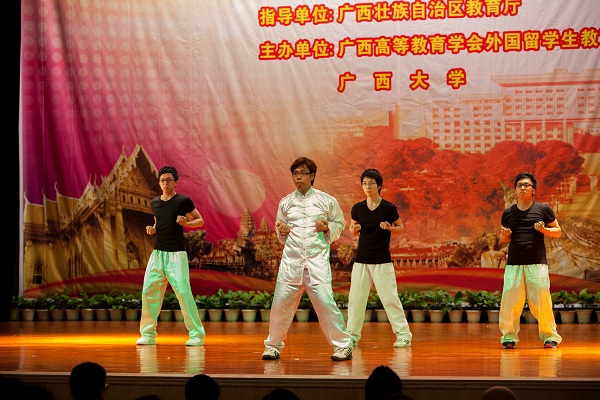 在泼水节文艺演出中,Beat365组织了一支由印度尼西亚、柬埔寨、马来西亚、美国、中国香港学生组成的22人表演队伍,在悠扬美妙的乐曲声中,学生们将我国太极拳和咏春拳的一招一式展现的淋漓精致,获得了在场领导、嘉宾、老师和同学们的一致好评和热烈的掌声,全面展示了Beat365外国及港澳台学生的良好精神风貌。