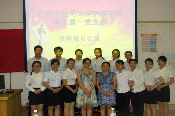 在庄严的党旗下,覃珊媚、梁子敏等14名拟发展对象依次上台严肃地宣读他们的入党志愿书,深切地表达了他们入党的迫切愿望、全心全意为人民服务的决心和为党的事业奋斗终身的勇气。支部里正式党员根据各位拟发展对象的日常学习生活工作情况,本着公平公正的态度对各位拟发展对象实行不记名投票表决。最终,14名同志成功通过表决。