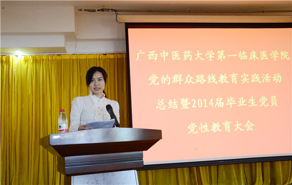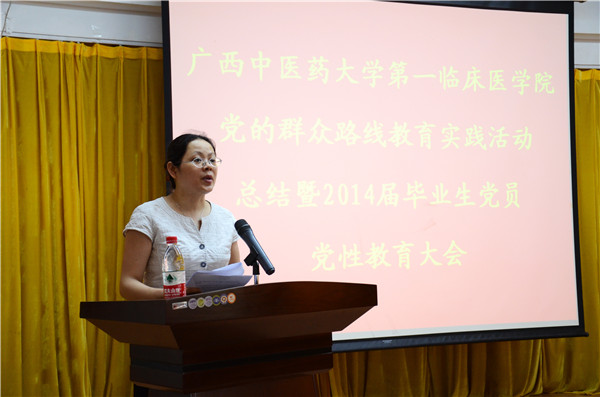 2014年6月5日上午,第一临床医学院在明秀校区大学生俱乐部三楼会议室召开第一临床医学院党的群众路线教育实践活动总结暨2014届毕业生党员党性教育大会。学院党委书记李敏智、教学部党总支书记、教学部负责人、学院全体政工人员及学院2014届全体毕业生党员参加大会。