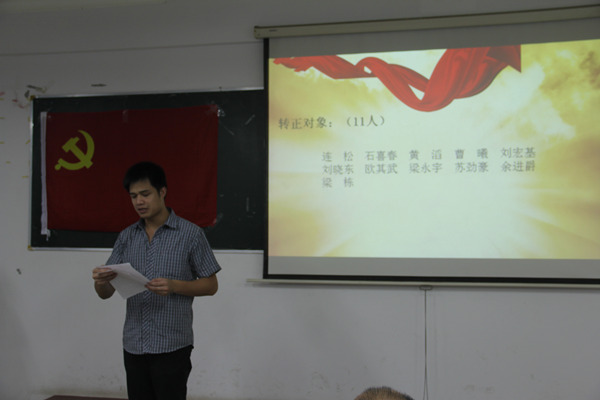 骨伤党支部周红海书记宣读了有关新党员入党的程序和《中国共产党发展党员工作细则》要求。以石喜春同志为代表的11位转正对象和3位发展对象依次上台分别宣读了转正申请书和入党申请书。在场的21位正式党员分别对转正对象和发展对象进行了民主评议和举手表决,整个流程严密紧凑而且公平、公正、公开,符合工作细则的要求。