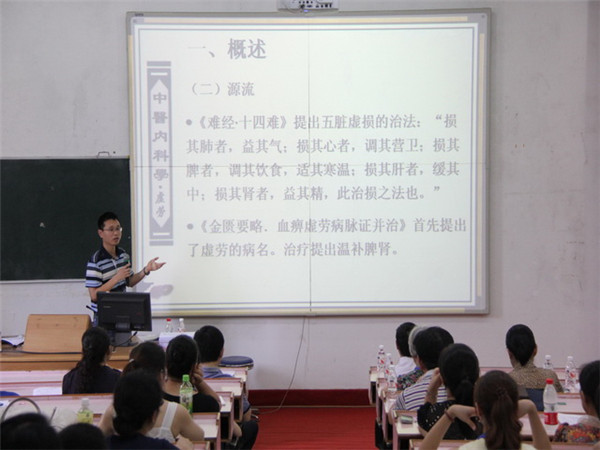 为加强青年教师队伍建设,进一步规范课堂教学管理和教研活动,促进教师课堂教学质量的提高,根据学校教师发展中心《关于组织开展2013~2014学年下学期教学示范课的通知》要求,第一临床医学院于2014年6月19日下午在明秀校区西梯一教室开展了公开示范课教学活动。本次活动由我院中医内科学教研室的程纬民老师进行《中医内科学—虚劳》为主题的示范授课,近200名骨干青年教师参加了观摩。