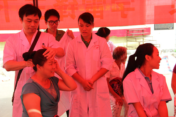 实践活动的主场地设在武鸣双桥镇市场旁的文化广播站内,内容主要包括:群众义诊、保健宣传、医患调查和慰问弱困四个方面。活动义诊小组为前来问诊的居民提供了血压测量、手法按摩、热灸贴耳、刮痧拔罐等基础医疗服务;保健小组在市场周围向前来赶集的群众提供保健咨询、发放保健资料和消暑药品;调查小组在镇上沿街挨户进行了问卷发放、调查讲解和群众意见收集;慰问小组的高职院党员、教师代表由双桥镇政府工作人员带领,分别给镇上两家弱困户进行了慰问走访,并赠送慰问品。活动过程中各实践小组热情高涨、行动有序、协同合作,大家都以实际行动来表明了自己对社会的关爱之心。