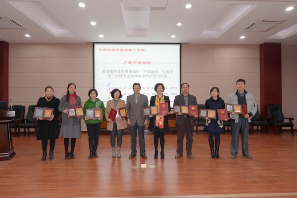 广西中医学校《养老服务业发展视角的“产教融合、公建民营”护理专业实体建设的研究与实践》荣获国家级2014年职业教育教学成果一等奖,这在广西职教系统为零的突破。为此,成果主要完成人吴彬今年9月还荣幸地代表广西到北京人民大会堂参加庆祝第30个教师节暨全国教育系统先进集体和先进个人表彰大会,接受了党和国家领导人的亲切接见。