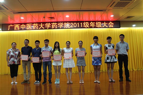最后,活动进行到了尾声,由药学院党委副书记李豫萍老师、药学院学生工作办公室主任凌勇威老师为获得荣誉的毕业生颁奖并合影留念。此次颁发的分别是以曾莉娟等4同学为代表的“广西高校优秀毕业生”奖、以邱朝辉等8同学为代表的“校级优秀毕业生”奖、以潘翠柳为代表的10名“优秀学生干部”奖以及以赖英栋为代表的8名“优秀班长”奖。同时李豫萍副书记对他们送去了寄语,希望他们能戒骄戒躁,踏实地将这份敢为人先、力争上游的精神运用到今后的工作生活当中去。