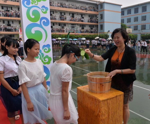 吴彬校长在雨中为学子们洗礼