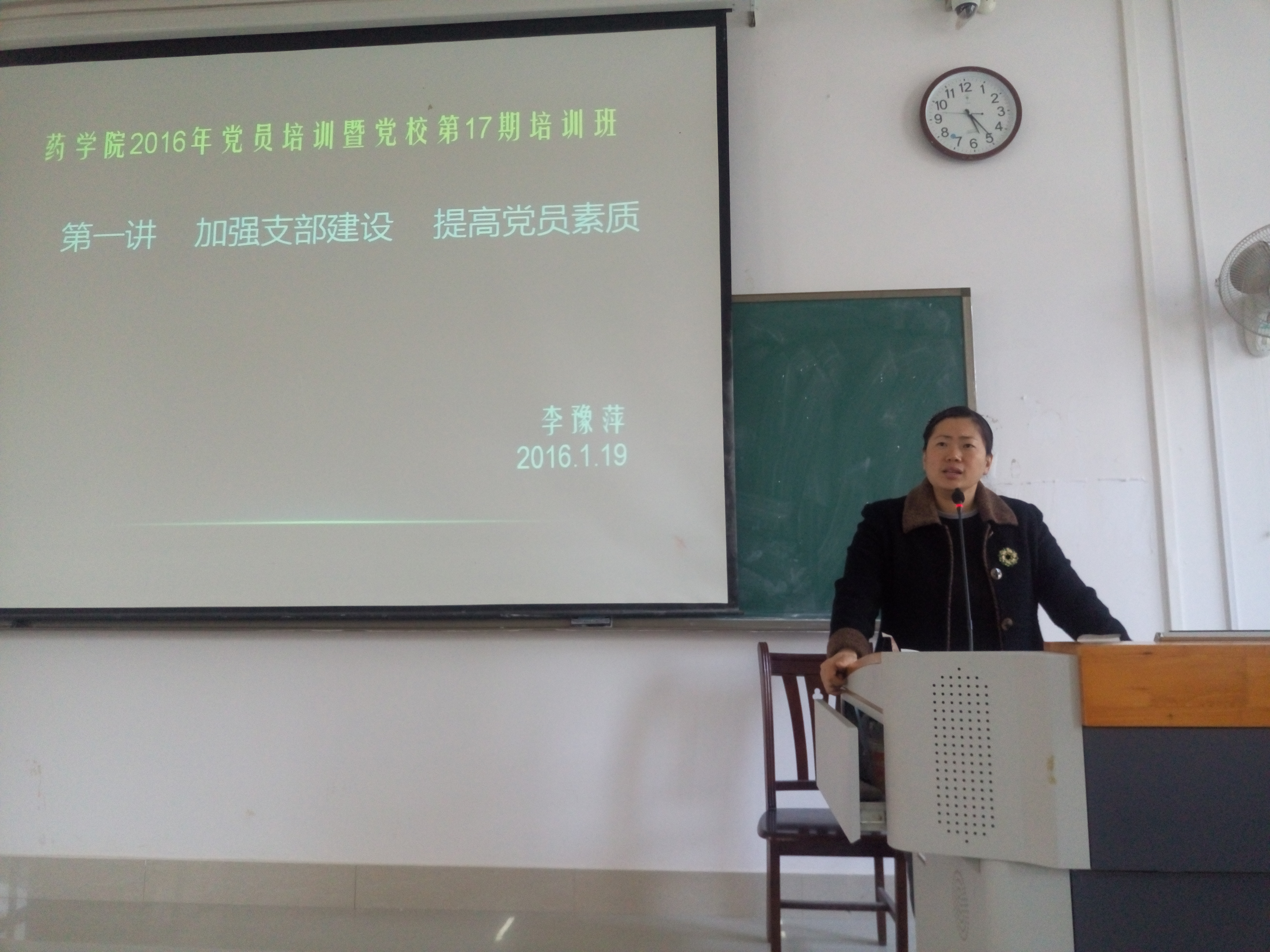 2016年1月18日下午,药学院2016年党员培训暨党校第17期班训班开班仪式在仙葫校区2-301教室举行。药学院党委副书记李豫萍、药学院2013级党支部书记王金兰、2015级年级辅导员管海钦以及学生党支部162学生党员参加此次开班仪式。