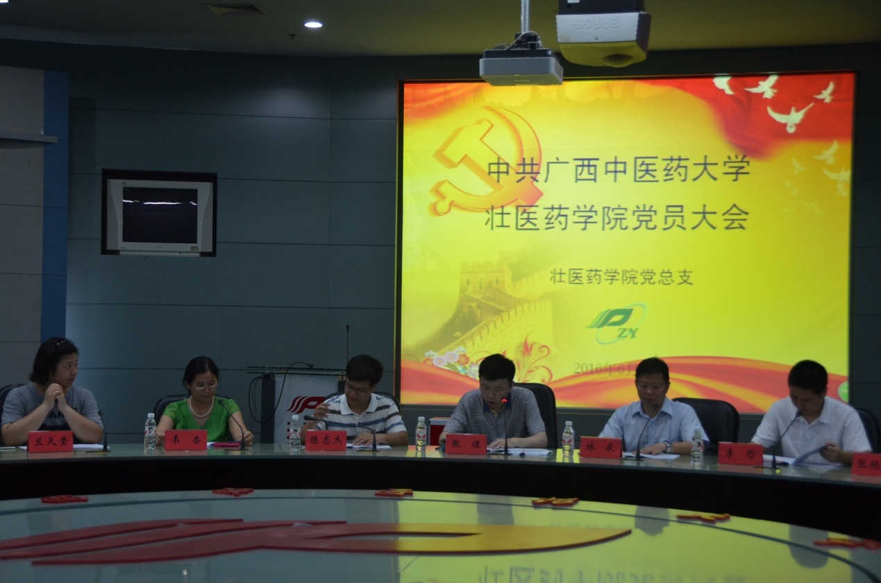 2016年6月3日上午,中共壮医药学院党员大会于会展中心7楼多功能厅召开。大会由壮医药学院张煜书记主持,党委统战部陈志杰副部长、壮医药学院林辰院长、韦杏副院长、瑶医药学院李彤院长、壮医药学院和瑶医药学院全体党员参加大会。