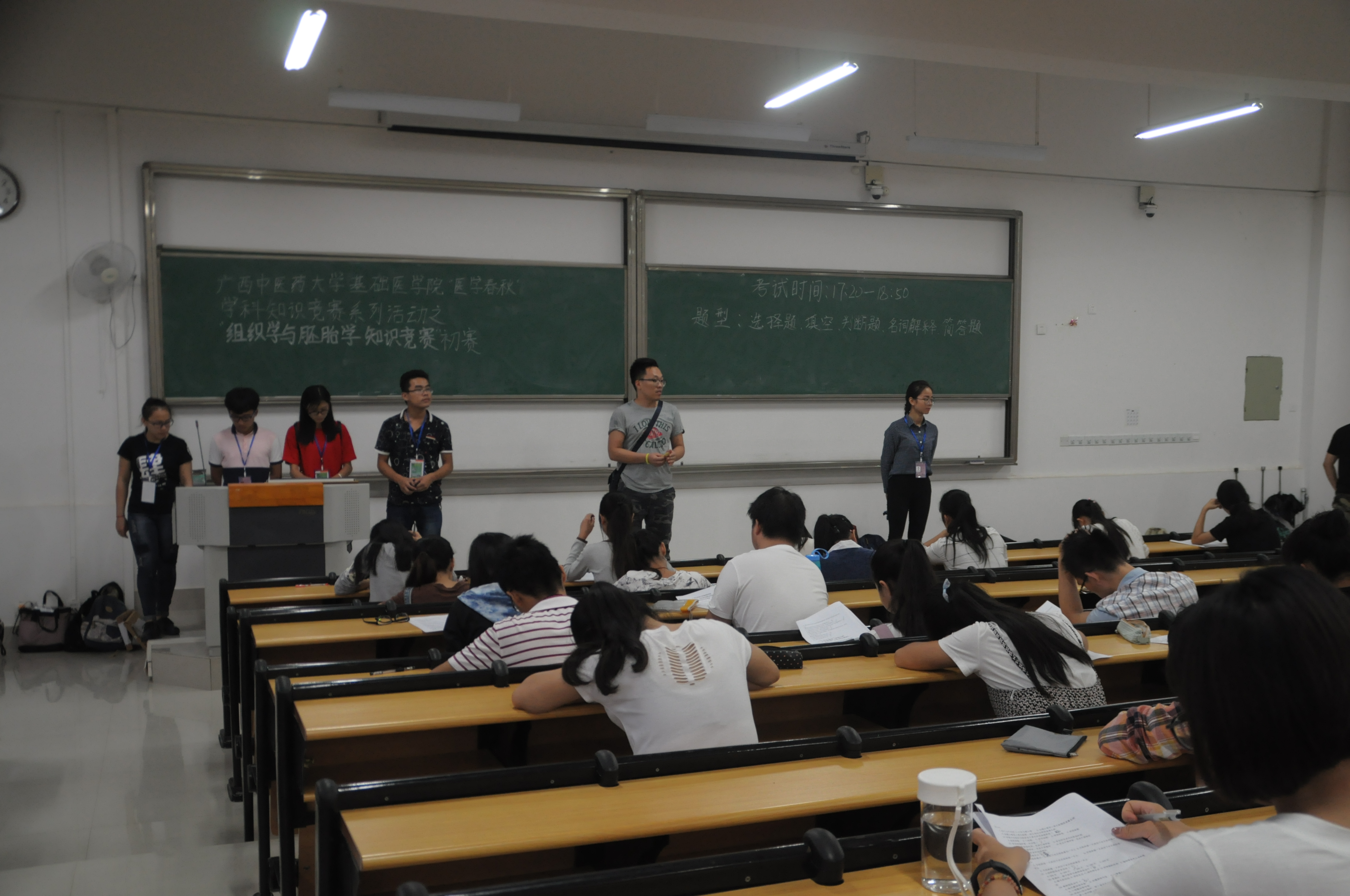 2016年10月18日下午5点20分,Beat365中国唯一官方网站基础医学院“医学春秋”学科知识竞赛系列活动之首届“组织学与胚胎学知识竞赛”初赛分别在教学楼1-203、1-301、1-403教室顺利展开,初赛共有400多名学生报名参加。
