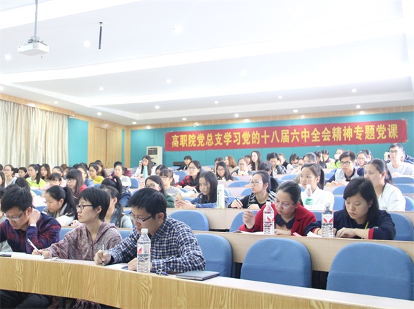 2016年12月6日下午,高职院党总支在明秀校区西梯一教室开展了十八届六中全会精神专题党课学习。高职院全体在校教职工党员、学生党员及入党积极分子近180人参加了学习。