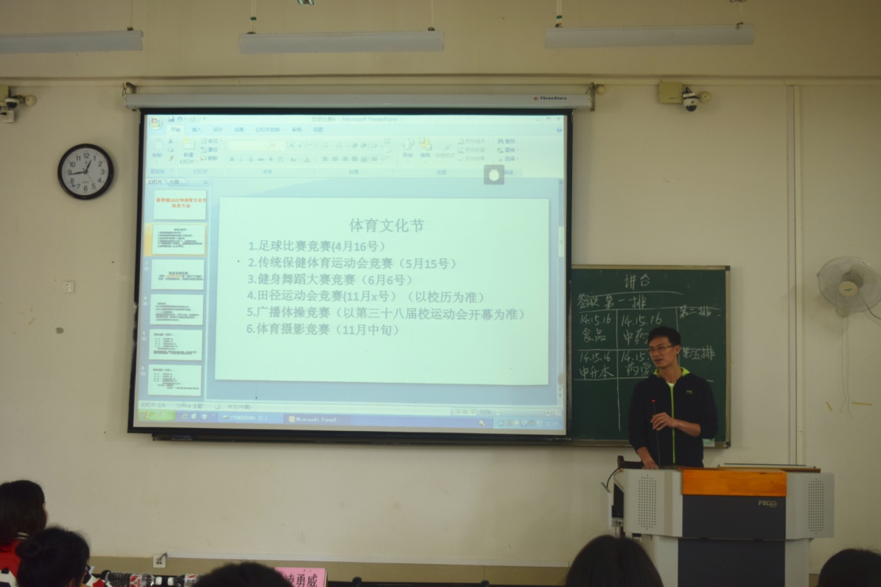会议中,药学院体育部成员李彬对这个体育文化节的系列活动及安排做了整体部署,特别是着重将足球比赛的赛程、时间及运动员选拔规则向各班级负责人作了介绍。本次足球联赛由校体育部承办,校学生会、校足协协办。并将于4月16日在仙葫校区正式拉开序幕。药学院则会在正式开赛前从药学、中药学、食安、食科、中升本各专业中,选拔出男队与女队各18人参与到校足球联赛荣誉的角逐中。
