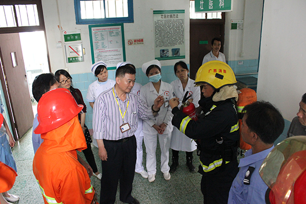 扶绥县消防大队针对此次消防演练做了详细的演练方案,认真细致地介绍了预防火灾的基本知识、火灾类型以及一些消防设施的使用方法,如:灭火器操作、消防水袋连接收卷、消防枪头连接等等。县消防大队结合医院特点,针对火灾发生后如何自防自救、引导病员紧急疏散以及逃生的方法做了详细的演练。