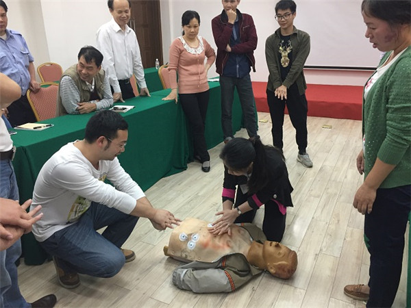 4月25日下午,受自治区发改委培训中心的邀请,一附院外联拓展部组织急诊科黄丹副主任医师、易海魁主治医师前往发改委培训中心进行救护技能培训。该中心教职员工50余人参加了培训。
