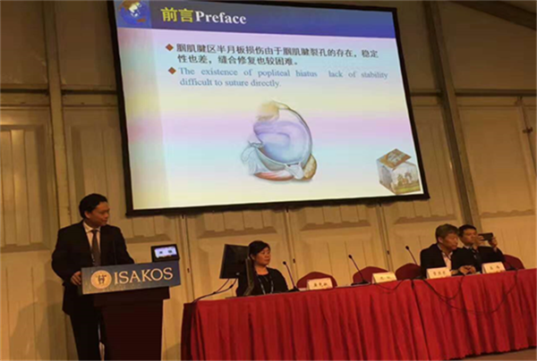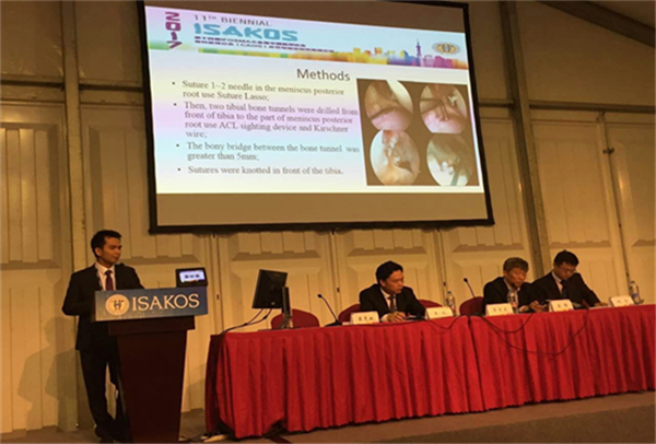 在ISAKOS大会召开的同时,第十四届上海国际关节镜骨科运动医学论坛(IFOSMA)暨中国医师协会骨科医师分会(CAOS)关节与运动创伤高峰论坛同时召开。本次中国IFOSMA作为桥梁对接ISAKOS国际双年会,主要针对中国医生在运动医学不同领域的研究成果进行征集,半月板损伤专题主要由米琨教授、章亚东教授刘宁教授、吕伟教授和黄竞敏教授等进行会前策划和筹办,最终16篇相关优秀稿件入选,其中一附院占两篇,米琨教授主持并做《Short-term Efficacy Of Repairing Lateral Meniscus Tears Involving The Popliteal Tendon Area》大会发言,蒙延雄主治医师做《Arthroscopic Repair Of Meniscus Posterior Root Tear With Tibial Tunnel Technique》专题发言,向参会代表介绍了我们在半月板特殊损伤类型的最新研究和治疗观点,得到了在场嘉宾的广泛认可和一致好评,为我们广西的运动医学赢得了声誉。
