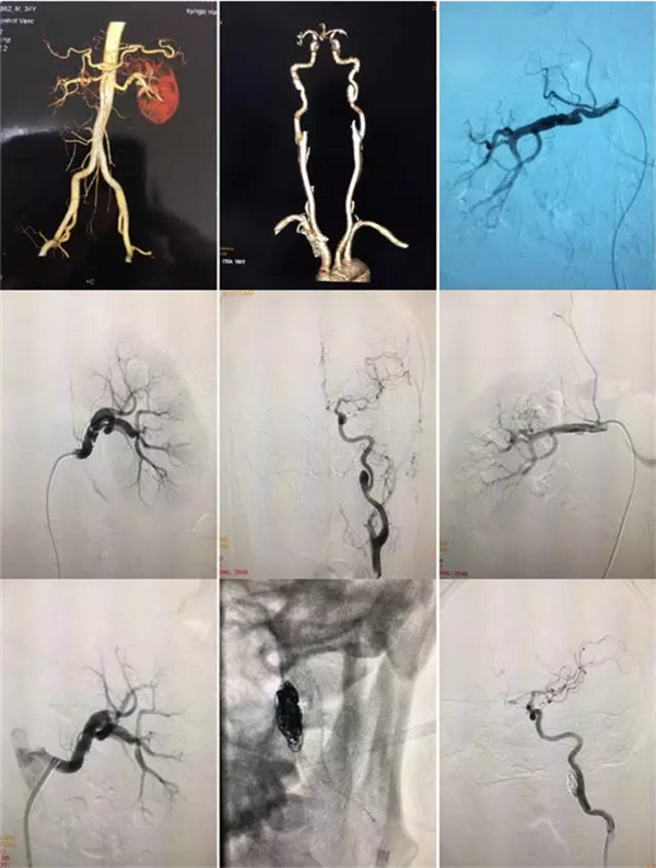 就在联合体共建推进会前一周,河池市中医医院推荐了一名“肾动脉狭窄”病人,经与一附院介入科罗耀昌主任沟通,联系病人收住我院外五科。病人是35岁男性,头昏脑胀,血压高达190一210/90一110mmHg!经全面检查诊断为:动脉肌纤维发育不良(病情累及了双侧肾动脉、双侧颈内动脉并多发严重狭窄、夹层瘤形成),经介入科团队共同努力,通过两次微创介入治疗行球囊支架成形术和支架辅助十微弹簧圈栓塞后,三支严重狭窄伴夹层瘤血管完全恢复通畅,血压恢复正常,精神状态焕然一新!