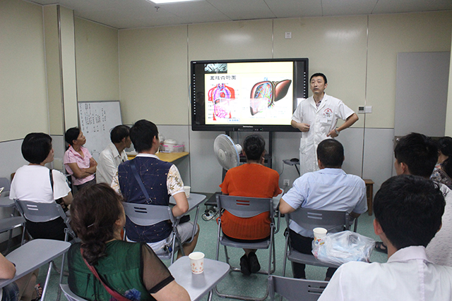 健康讲座上,盛庆寿主任和刘旭东副主任分别作《共抗乙肝 绿色家园》和《脂肪肝防治小知识》专题讲座,他们用通俗易懂的语言为30多位群众讲解了慢性乙肝的认知及治疗误区、慢性乙肝的诊断与临床类型、慢性乙肝怎样治疗、脂肪肝的形成原理和危害、脂肪肝的治疗以及科学的自我管理等方面的肝病防治知识,告诫大家肝病可防可治,不需要过度恐慌,一定要到正规医院肝病专科进行科学治疗,而医院中西医结合是治疗肝脏疾病的最佳手段。