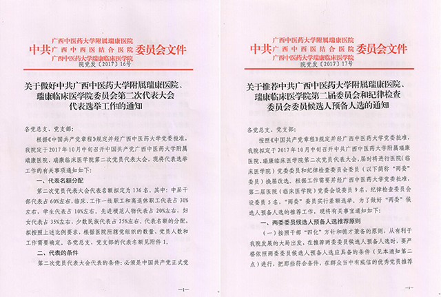 8月11日,医院党委分别下发《关于做好中共Beat365中国唯一官方网站附属瑞康医院、瑞康临床医学院委员会第二次代表大会代表选举工作的通知》(院党发〔2017〕16号)和《关于推荐中共Beat365中国唯一官方网站附属瑞康医院、瑞康临床医学院第二届委员会和纪律检查委员会委员候选人预备人选的通知》(院党发〔2017〕17号),要求各党(总)支部把选举“两委”委员和党代表列入重要工作日程,认真做好选举中的组织工作和思想政治工作,切实加强领导、精心组织、周密安排,充分发扬党内民主,认真执行民主集中制原则,尊重党员的民主权利,体现选举人的意志,如期完成选举工作。
