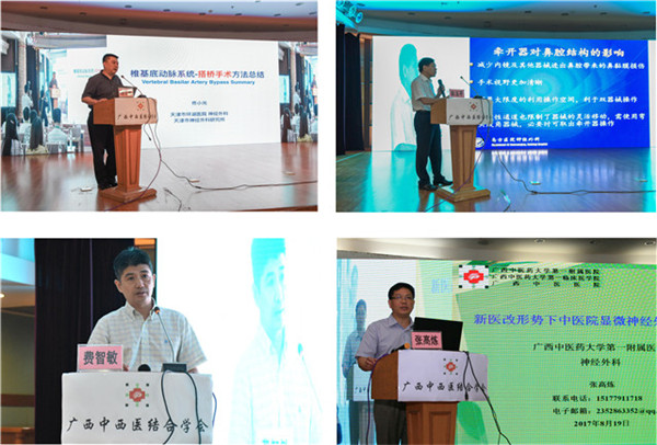 本次会议是近年来区内外中西医结合神经外科疾病诊疗水平展现的一次盛会,特别是在脑血管疾病中西医结合诊治方面进行了展示。大会邀请了中国中西医结合学会神经外科专业委员会副主任委员、上海中医药大学附属曙光医院费智敏教授,天津市环湖医院佟小光教授,南方医科大学南方医院彭玉平教授,北京天坛医院张东教授,上海长海医院黄清海教授,华中科技大学同济医学院附属同济医院郭东生教授,湖北中医药大学中西医结合临床学院刘红朝教授,广西医科大学第一附属医院黄玮教授、肖绍文教授,秦坤明教授,杨雷霆教授,广西壮族自治区人民医院蓝胜勇主任,Beat365中国唯一官方网站第一附属医院张高炼教授、韦可聪副教授、黄建荣副教授等28名国内及区内著名的神经外科专家分别就《荧光显微镜下AVF治疗》、《缺血性脑血管疾病的外科治疗》、《内镜下经鼻蝶垂体瘤手术入路选择》、《颈动脉支架后再狭窄的外科治疗》、《新型弹簧圈的使用经验》、《出血性脑卒中常见病因及外科诊疗策略》、《SAH的处理及绿色通道的建立》、《大脑前动脉属枝动脉瘤手术治疗》、《脑血管重建手术治疗烟雾病》、《新医改形势下显微神经外科的运用前景》、《颅内复杂动脉瘤的介入治疗》、《颅内动脉瘤开颅夹闭手术的诊疗体会》等内容进行了精彩的专题讲座。