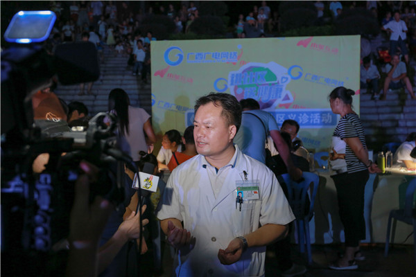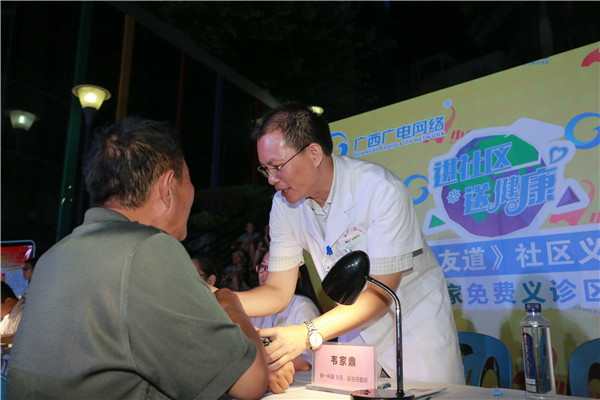 为倡导健康的生活方式,促进社区居民健康水平提升,一附院与广西影视频道《健康老友道》栏目组携手,共同策划了为期三个月的“进社区 送健康”大型社区义诊系列公益活动。9月9日晚,一附院仙葫院区教授博士团如约来到阳光新城社区广场开展“进社区 送健康”活动,此次义诊专家来自骨科、康复医学科、妇产科、儿科、脾胃肝病科、壮医科等科室。