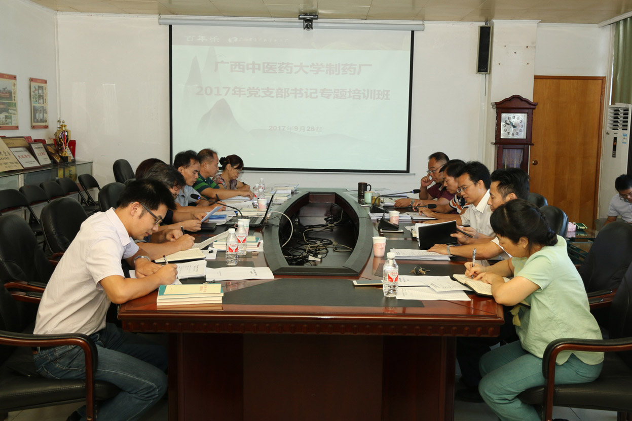 为加强党务干部队伍建设,进一步提高党支部书记落实全面从严治党要求和推动“两学一做”学习教育常态化、制度化的素质能力,进一步提升制药厂基层党建工作的政策理论水平和业务能力,2017年9月26日,制药厂党委举办2017年党支部书记培训班。制药厂党委书记、厂长何天富,党委副书记、纪委书记彭定基,副厂长陈洪涛、吴玉强,副处级调研员张义欢以及各党支部书记等参加会议。会议由制药厂党政办主任、宣传策划部部长罗少佳主持。