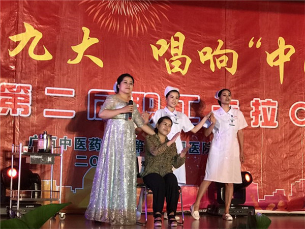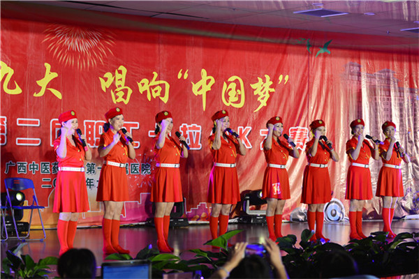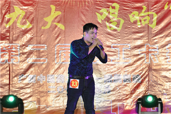 为欢度新中国成立68周年国庆,喜迎党的十九大胜利召开,激发一附院广大职工“爱国、爱党、爱中医”的豪迈之情,为“广中医”的建设凝聚正能量,推动“广中医”更好更快发展, 9月28日晚上,以“喜迎十九大,唱响中国梦”为主题的“广中医”第二届职工卡拉OK大赛,在一附院住院综合楼5楼多功能厅拉开序幕,20名经过预赛脱颖而出的参赛选手依次登场,为现场观众带来了一场音乐饕餮盛宴。一附院党委书记李敏智虽出差在外,仍时刻关心着本次大赛的进展情况,她通过主持人转达她的祝福,并预祝大赛取得圆满成功。医院党委副书记、纪委书记兼工会主席周广林亲临大赛现场观看。医院部分中层干部、职工、学生及音乐爱好者等近400人到现场观看了比赛。