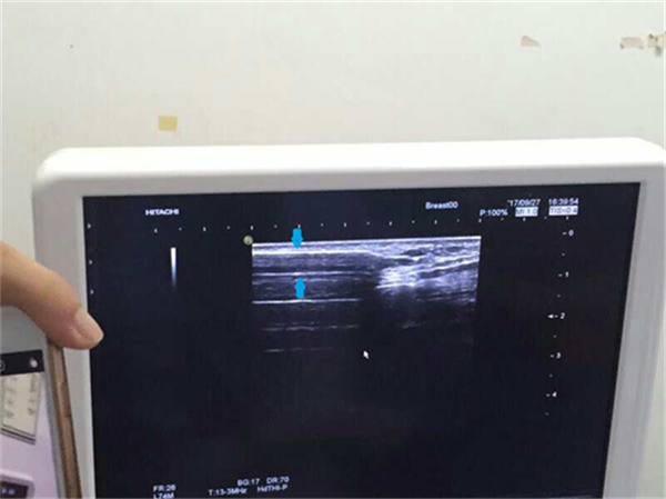 治疗前B超下内瘘血管可见明显狭窄(双凹切迹,红色箭头处)