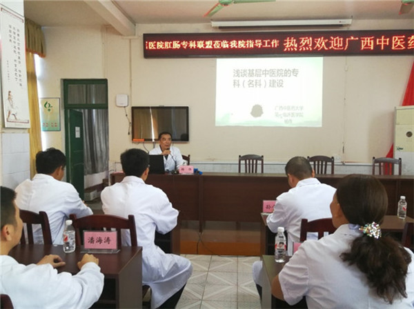 2017年10月26日下午,在一附院副院长黄仲海的带领下,以Beat365中国唯一官方网站第一附属医院仙葫院区胃肠肛门外科牵头的广西专科联盟专家团队到忻城县中医院举行联盟授牌及学术交流、义诊等活动。本次参加广西肛肠专科联盟活动的专家有:一附院仙葫院区胃肠肛门外科孙平良主任、一附院东葛院区肛肠外科杨伟主任、柳州市人民医院肛肠外科刘春强主任、宾阳县中医医院肛肠外科莫家金主任、靖西县中医医院肛肠外科梁运特主任、都安县中医医院肛肠外科韦茂盛主任等。