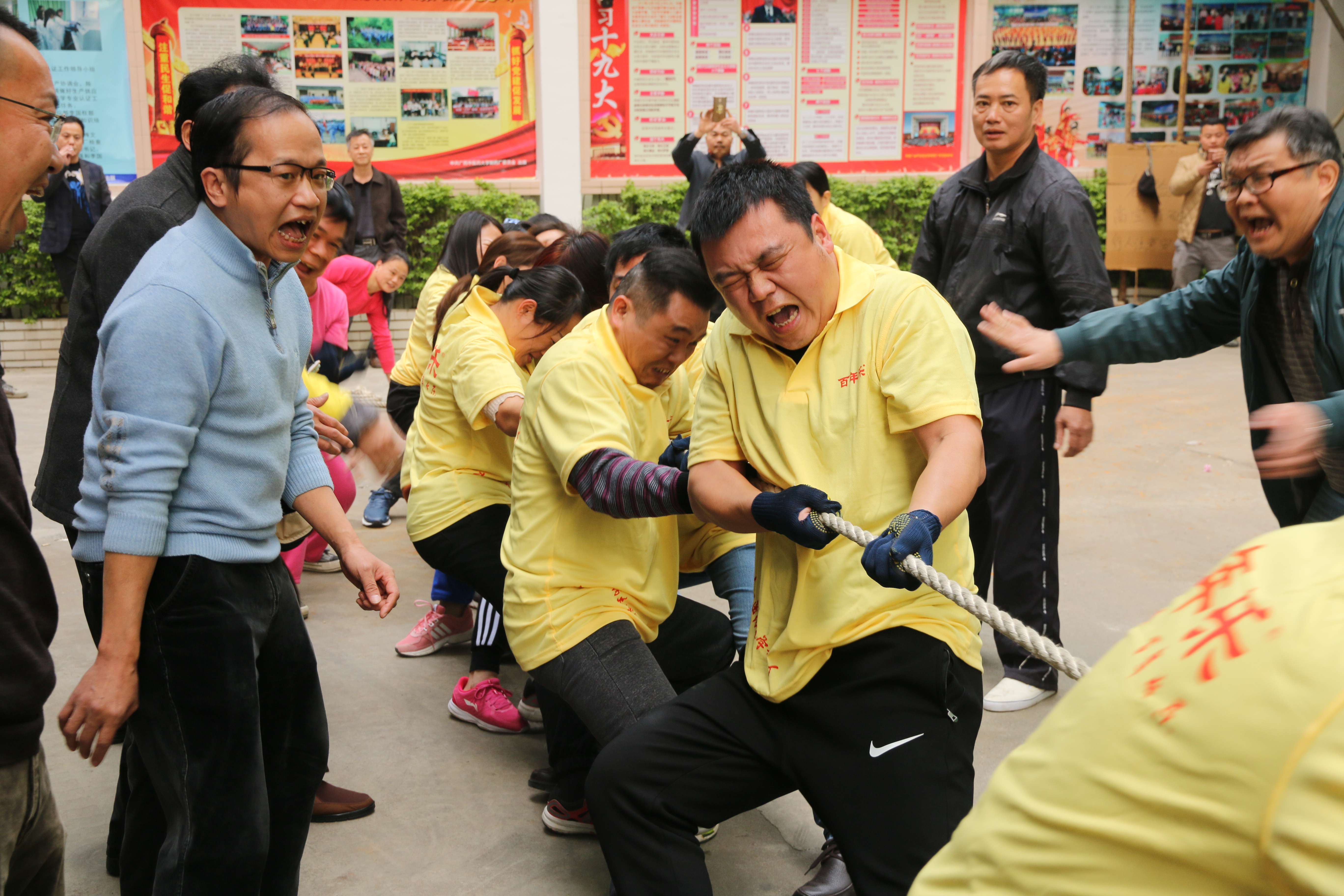 拔河比赛由5个工会小组组成,每组13人。下午四点,随着裁判员一声哨响,比赛正式开始。队员们紧握长绳,憋足了劲拼命往后拉。只见大绳游离在地面白线之间,忽左忽右,忽前忽后,一时间呐喊声、加油声此起彼伏,响成一片。赛场上的队员个个斗志昂扬,面对强劲的对手,毫不退却,咬紧牙关,坚持到底;赛场外的拉拉队们热情高涨,呐喊声助威声此起彼伏,无论是场上还是场下,气氛都异常热烈。