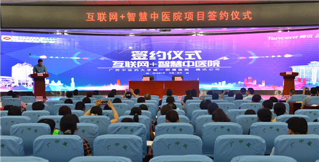 7月24日,一附院与腾讯公司“互联网+智慧中医院”项目签约仪式在一附院住院综合楼5楼学术厅举行,这标志着广西首家“互联网+智慧中医院”及“广西中医药发展联合体网络信息平台”正式落户一附院。自治区中医药管理局副局长陈赤,一附院院长谢胜、党委书记桂雄斌,腾讯公司西南片区总经理潘华,以及我一附院党政班子其他成员,腾讯公司及其合作公司领导,紧密型医联体单位领导,我一附院全体中层干部300余人共同见证了签约及项目启动仪式。仪式上,谢胜院长和潘华总经理分别进行了致辞,腾讯公司顾问雷舜东博士和张灵丽教授分别进行了授课。签约启动仪式由我院桂雄斌书记主持。