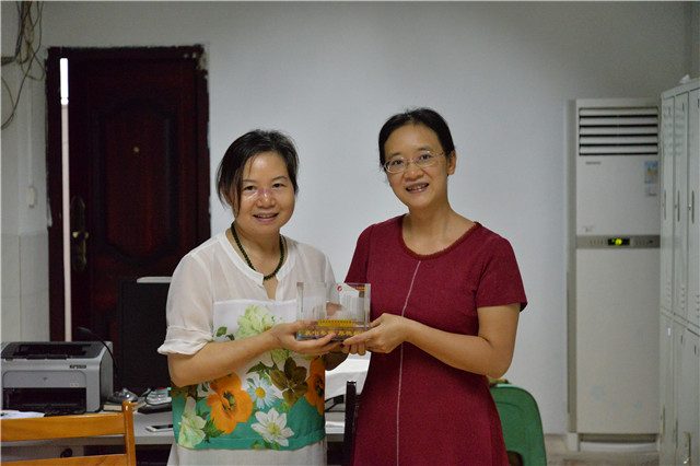 最后,人力资源部职改办主任彭爱莲代表医院向姜振兰和滕南南赠送纪念品,并合影留念。